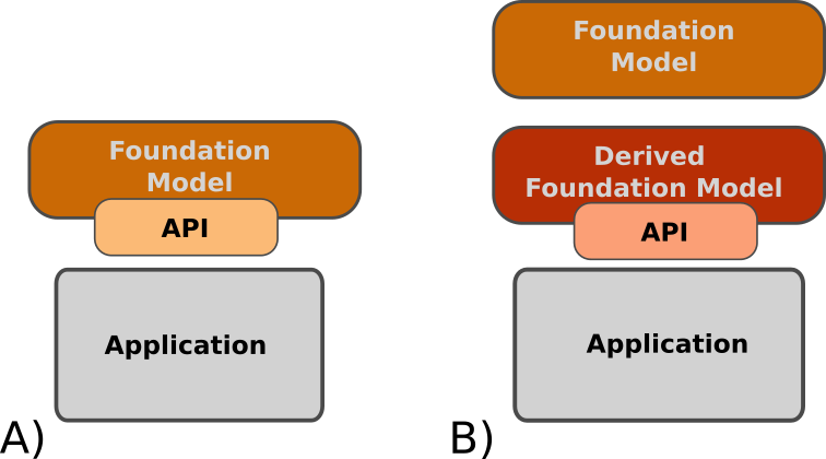 Derived model (from a foundation models). Derivatives of foundation models will themselves be more directly integrated in a software sense through a API. That API can match the original foundation model, or be specific to the derived model. The resulting derived model can also be a foundation.