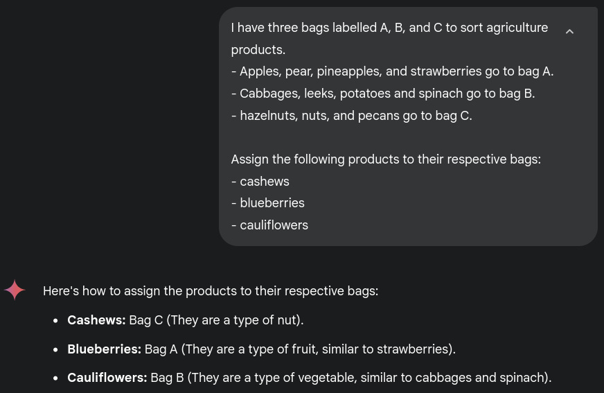 In context learning can be thought of as a type of prompt where examples of what is expected are provided instead of textual directions. Because of this, it is as easy to use as prompting, although what it requested is subject to more “interpretation” by the model. The example below uses Gemini 2.5 Flash to demonstrate how in-context learning can work, and the ability of the model to infer latent information thanks to the broad data it was trained on. Here our three short lists of products imply that they are for fruits, vegetables, and nuts without telling it directly.